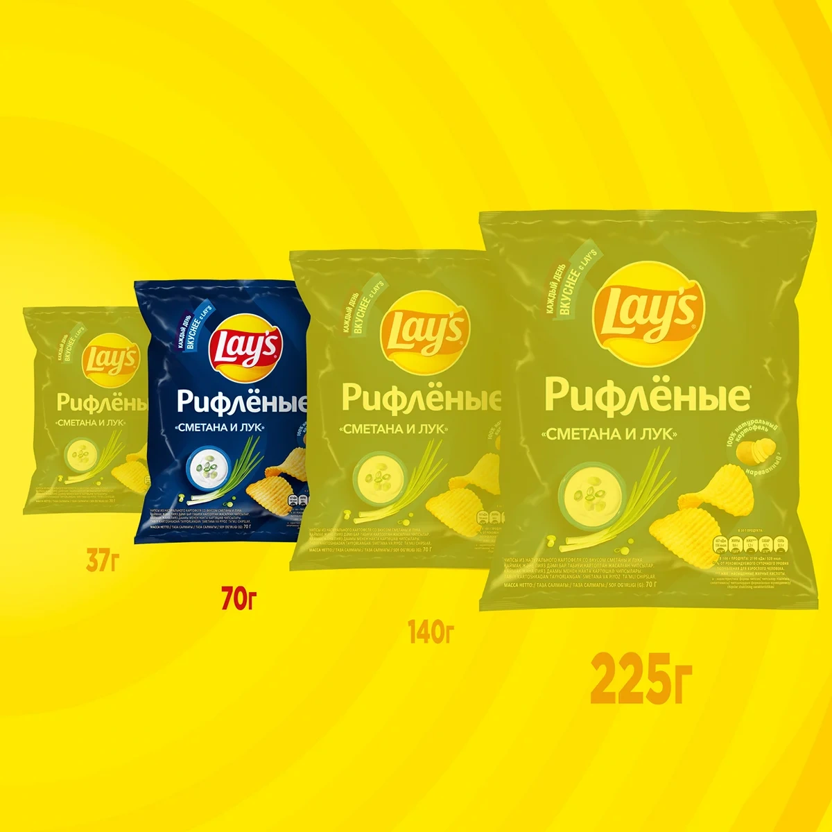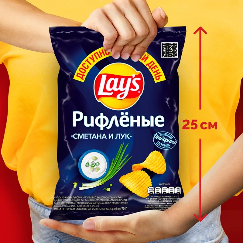 В этой упаковке представлен вкус с ароматом душистых стеблей молодого зеленого лука и сметанки. Упаковка содержит большое количество чипсов, что позволяет их хватить на всю семью.