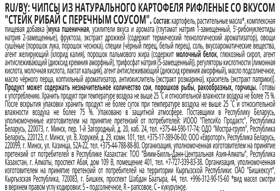 Картофель, растительные масла подсолнечное и рапсовое, ароматизатор, соль, вкусоароматические вещества, содержащие порошки лука, петрушки, чеснока, сметаны, порошок молочной сыворотки, сахар, усилитель вкуса и аромата глутамат натрия 1-замещенный, регуляторы кислотности лимонная кислота, диацетат натрия.