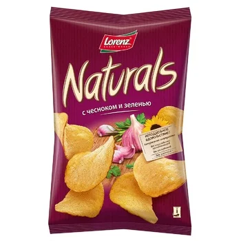 Картофельные чипсы Naturals с чесноком и зеленью 100 г. Пряная чесночная нотка в сочетании с ароматными травами выделяют Naturals с чесноком и зеленью среди других чипсов. В составе всех чипсов Naturals не используются консерванты, искусственные ароматизаторы. Naturals – неподдельное удовольствие!
