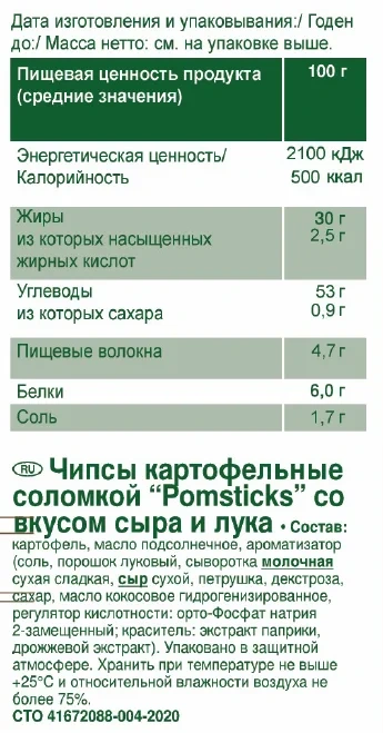 Это не просто чипсы, а цельный картофель, нарезанный тонкой соломкой и обжаренный до хрустящей корочки. Сыр и пикантная луковая нотка - гармоничное сочетание с картофельным вкусом Pomsticks.Порадуют всех любителей картофельных чипсов утонченным вкусом.