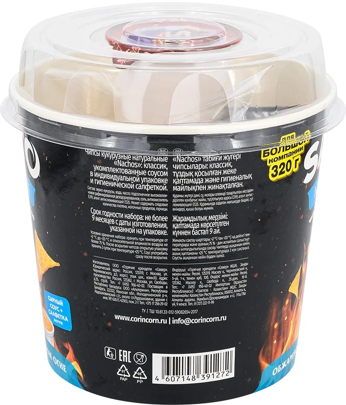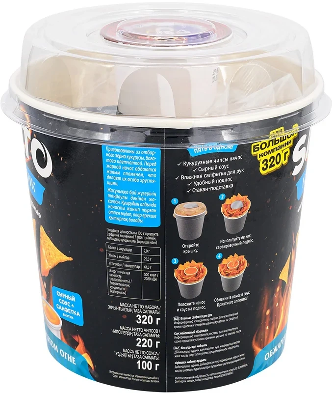 Отборное зерно кукурузы, кокосовое масло, легкая карамель из тростникового сахара демерара и сладко-соленый вкус печенья. Кукурузные начос классик 220 г с сырным соусом 100 г и влажной салфеткой.