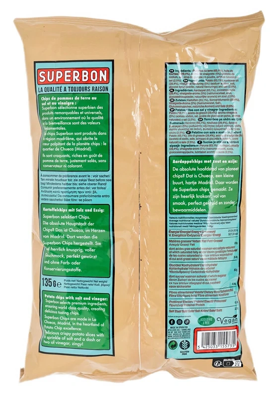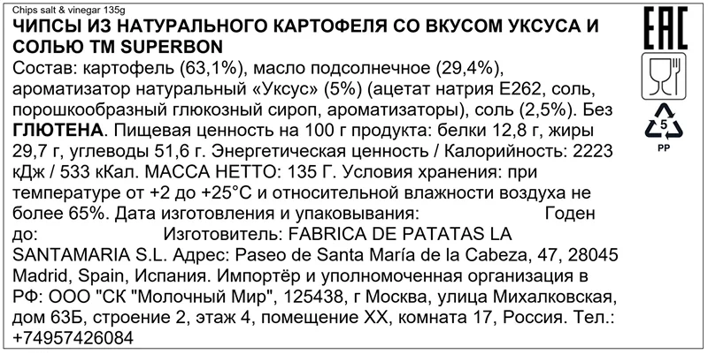 Чипсы картофельные Superbon с солью и уксусом, 135г