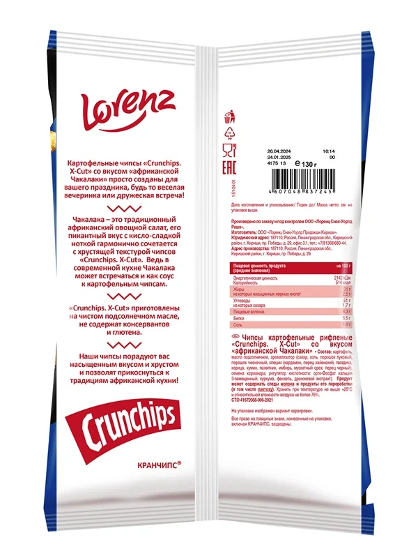 Чипсы Lorenz Crunchips X-Cut рифленые Чакалака, 130г