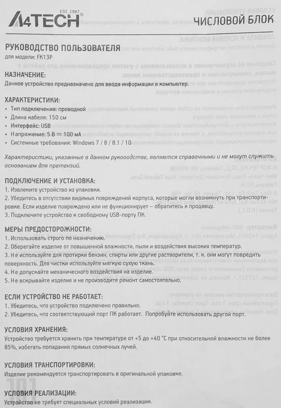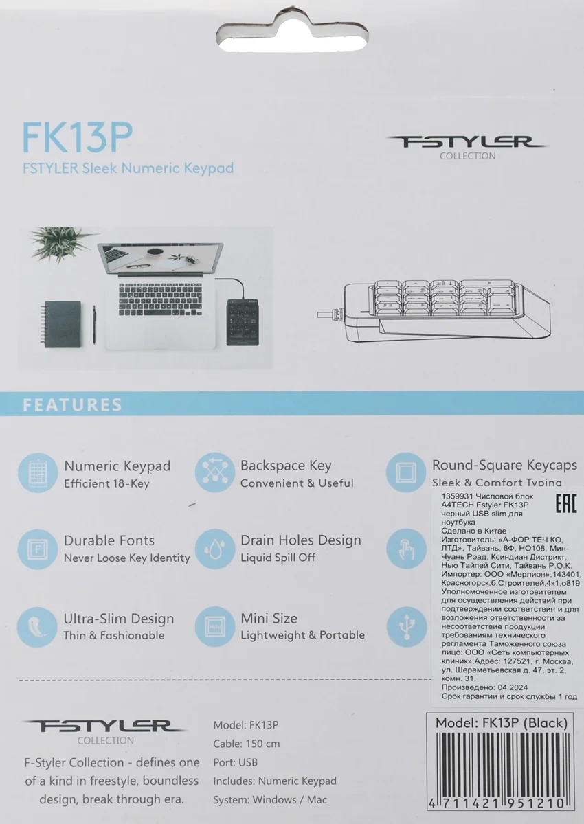 Числовой блок A4Tech Fstyler FK13P черный USB slim для ноутбука (FK13P BLACK)