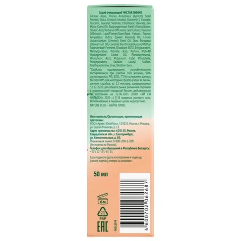 Состав: Aqua, Prunus Armeniaca (Apricot) Seed Powder (измельченные абрикосовые косточки), Silica, Cetearyl Alcohol, Glycereth-2 Cocoate, Glycerin, Glyceryl Stearate, Ethylhexyl Stearate, Kaolin, Zea Mays (Corn) Oil, Butyrospermum Parkii (Shea) Butter, Stearic Acid, Verbena Officinalis Leaf Extract (экстракт вербены), Paeonia Officinalis Leaf/Flower/Stem/Root Extract (экстракт пиона), Prunus Amygdalus Dulcis (Sweet Almond) Oil (миндальное масло), Linum Usitatissimum (Linseed) Seed Oil (льняное масло), Olea Europaea (Olive) Fruit Oil (ферментированное масло оливы), Candida Bombicola/Glucose/Methyl Rapeseedate Ferment, Disodium EDTA, Ethylparaben, Methylparaben, Palmitic Acid, Parfum, PEG-40 Hydrogenated Castor Oil, Phenoxyethanol, Phosphoric Acid, Potassium Cetyl Phosphate, Propylparaben, Sodium Lauryl Sulfate, Triethanolamine, Urea, Xanthan Gum.