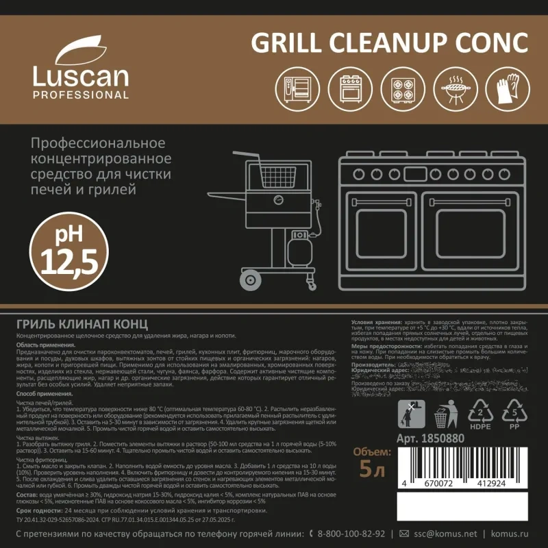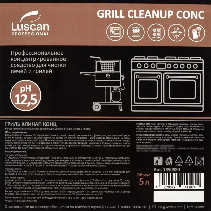 Чистящее средство для кухни удаление жира и нагара Effect Gamma G302 1 л (концентрат). Назначение: Средство предназначено для профессионального и бытового применения: для удаления особо стойких жировых загрязнений и нагара с плит, духовых шкафов, микроволновых печей, грилей, барбекю, вытяжек, разделочных столов, кухонных фартуков, конфорок, шампуров, казанов и аналогичных поверхностей, устойчивых к действию щелочей, в гостиничном секторе, на объектах ЖКХ, образовательных учреждениях, включая школьные и дошкольные, ЛПУ, предприятиях общественного питания и пищевой промышленности, в офисных помещениях. Способ применения: Перед чисткой электроприборов отключить их от источника тока. Нанести средство на остывшую загрязненную поверхность, выдержать 20 секунд, протереть влажной салфеткой, смыть водой и протереть насухо. В случае стойких загрязнений - повторить действие, увеличив время обработки до 1 минуты. Поверхности, соприкасающиеся с пищевыми продуктами, тщательно промыть водой. Не использовать для чистки алюминиевых, полированных, лакированных, хромированных, нарушенных пластиковых и тефлоновых покрытий, а также окрашенных поверхностей. Состав: ? 15 %, но < 30 %: щелочь, НПАВ, смесь растворителей, < 5 % ароматизирующая добавка. Меры предосторожности: Опасно для кожи и глаз! Содержит щелочь! При попадании в глаза и на кожу вызывает химические ожоги. Вредно для водных организмов. Не вдыхать пары средства. При контакте с кожей может вызывать аллергическую реакцию. Не допускать попадания средства на кожные покровы и слизистые оболочки. Использовать индивидуальные средства защиты органов дыхания, очки, резиновые перчатки. При попадании на кожу - промыть большим количеством воды, обратиться за медицинской помощью. При попадании в глаза - осторожно промыть водой в течение нескольких минут, немедленно обратиться за медицинской помощью. Не смешивать с другими (кислыми средствами бытовой химии. Использовать средство только на остывшей поверхности. Перед использованием проверить стойкость покрытий в незаметном месте. Условия хранения: Хранить в плотно закрытой упаковке в прохладном, недоступном для детей месте, отдельно от пищевых продуктов и лекарственных средств. Средство замерзает, после размораживания сохраняет свои свойства. В бытовых условиях упаковку и, при необходимости, средство утилизировать как бытовой отход. Срок годности: 3 года с момента производства (при соблюдении условий хранения рекомендованных производителем).
