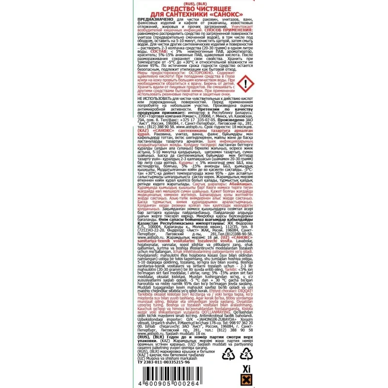Меры предосторожности: осторожно! Содержит щавелевую кислоту. При попадании в глаза или на кожу промыть большим количеством воды, при необходимости обратиться к врачу. Беречь от детей, хранить вдали от пищевых продуктов. Не смешивать с другими средствами бытовой химии. Использовать резиновые перчатки. Не применять для чистки чувствительных к действию кислот или повреждённых поверхностей. Перед использованием протестировать на небольшом участке.