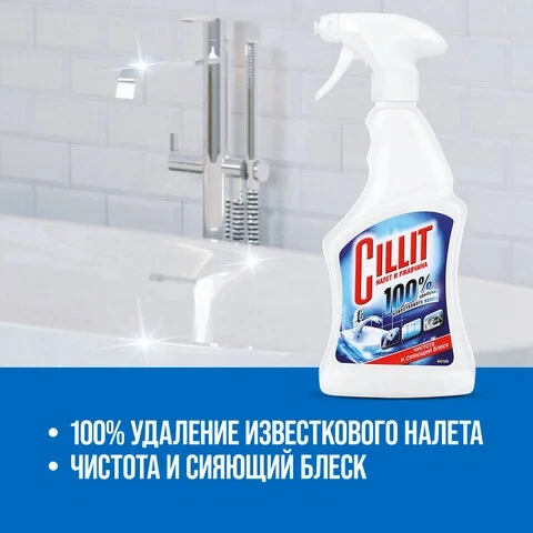 Средство CILLIT очищает поверхности в ванной комнате до блеска, а также удаляет известковый налет и ржавчину. Идеально подходит для поддержания чистоты в ванной.