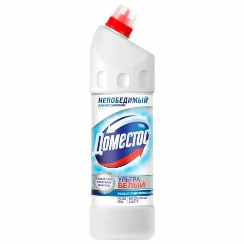 Чистящее средство для туалета и ванной Доместос 'Ультра Белый' поможет обеспечить чистоту и гигиену унитаза, устранение неприятных запахов, удаление плесени и мыльного осадка, антимикробную обработку малых поверхностей и предотвращение появления известкового налета.