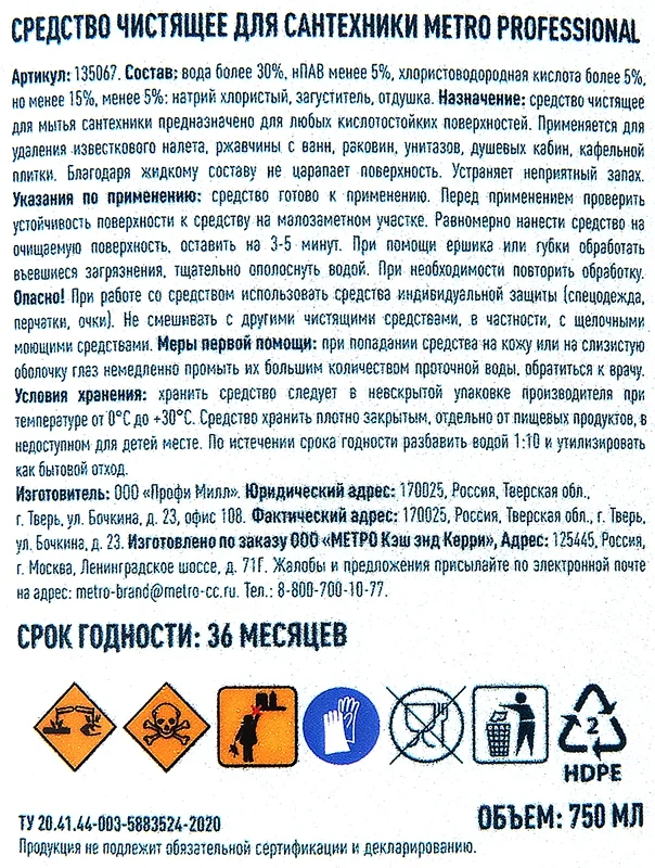 Незаменимое средство для чистки и ухода за ваннами, душевыми кабинами, кранами, раковинами, кафельной плиткой, унитазами, сливами и водостоками, любыми твёрдыми моющимися напольными покрытиями и настенными панелями. Эффективно удаляет серый налёт, жир, мыло, въевшиеся пятна и другие загрязнения, устраняет неприятные запахи. Раковины, ванны, унитазы, кафельная плитка: равномерно нанести средство на очищаемую поверхность (в случае сильного загрязнения оставить на 3 – 5 минут), удалить грязь губкой или мягкой щёткой, ополоснуть водой. Состав: ? 30 % вода, ? 15 %, но < 30 % отбеливающее вещество на основе хлора (< 5 % активного хлора), < 5 % АПАВ, < 5 % гидроксид натрия, < 5 % метасиликат натрия, < 5 % Амф. ПАВ, < 5 % парфюмерная композиция.