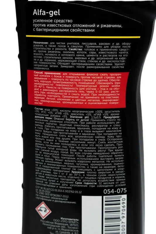 Опасно! Беречь от детей! Применять строго по назначению указанным способом. При работе использовать резиновые перчатки, защитные очки/маску, респиратор и спецодежду. Избегать проглатывания, вдыхания, попадания на кожу и в глаза. При попадании на кожу и в глаза вызывает химические ожоги. Вредно при проглатывании и вдыхании. При попадании на кожу: немедленно снять всю загрязнённую одежду. Кожу промыть водой или под душем. При попадании в глаза: осторожно промыть водой в течении нескольких минут. Снять контактные линзы, если вы ими пользуетесь и если это легко сделать. Продолжить промывание глаз. При проглатывании: прополоскать рот, обильное питьё холодной воды. Не вызывать рвоту! При вдыхании: свежий воздух, покой. Во всех случаях немедленно обратиться за медицинской помощью! После работы тщательно вымыть руки и лицо. Перед повторным использованием выстирать загрязнённую одежду. Может вызывать коррозию металлов. Не использовать на алюминиевых, медных, чугунных, хромированных,оцинкованных и эмалированных поверхностях, а также на мраморе, бетоне и глазурованной плитке! Не смешивать с щелочными и хлорсодержащими препаратами!