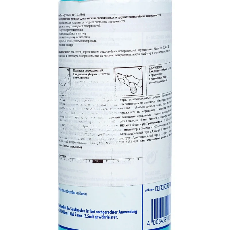 Чистящее средство для стекол и зеркал Dr.Schnell Glasfee 500 мл.Профессиональное средство Glasfee от Dr. Schnell предназначено для очистки стекол, зеркал и всех водостойких поверхностей. Применяется для ручной уборки спрей-методом и уборки с изделиями из микроволокна. Удобное и простое в использовании.Особенности и преимущества:- Быстро испаряется, не оставляет разводы и следы на поверхности.- Удаляет масло и жир с глянцевых поверхностей.- Не требует повторного нанесения.- Оставляет сияющий блеск и чистоту.- Препятствует повторному загрязнению.- Поверхность не нужно сушить и полировать.- Безопасен для кожи рук.- Продукт произведен в Германии. Область применения:Идеально для уборки коммерческой и некоммерческой недвижимости, производств, HoReCa и клининга.