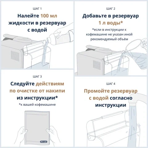 Эксклюзивная формула средства для очистки кофемашин от накипи гарантирует тщательную очистку и бережное обращение с хрупкими внутренними деталями устройства.