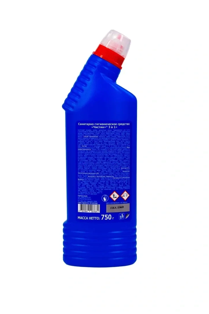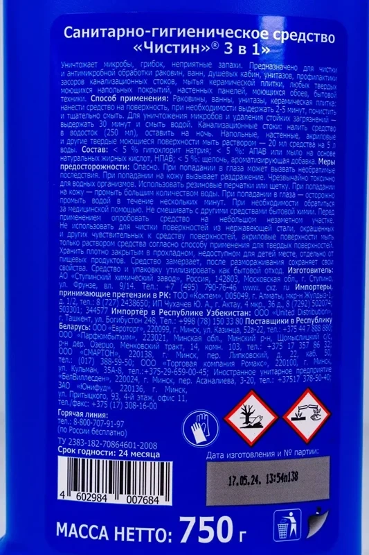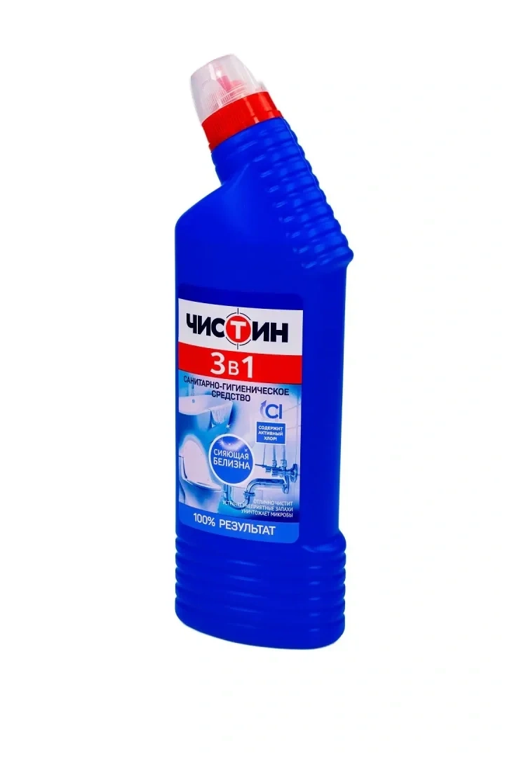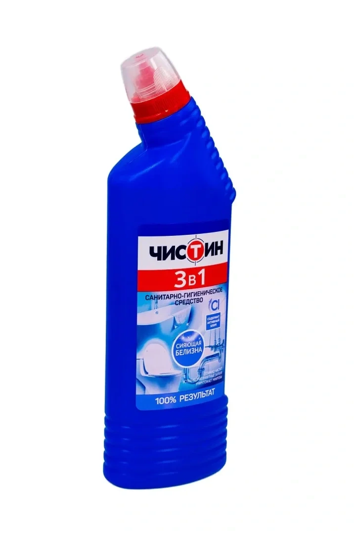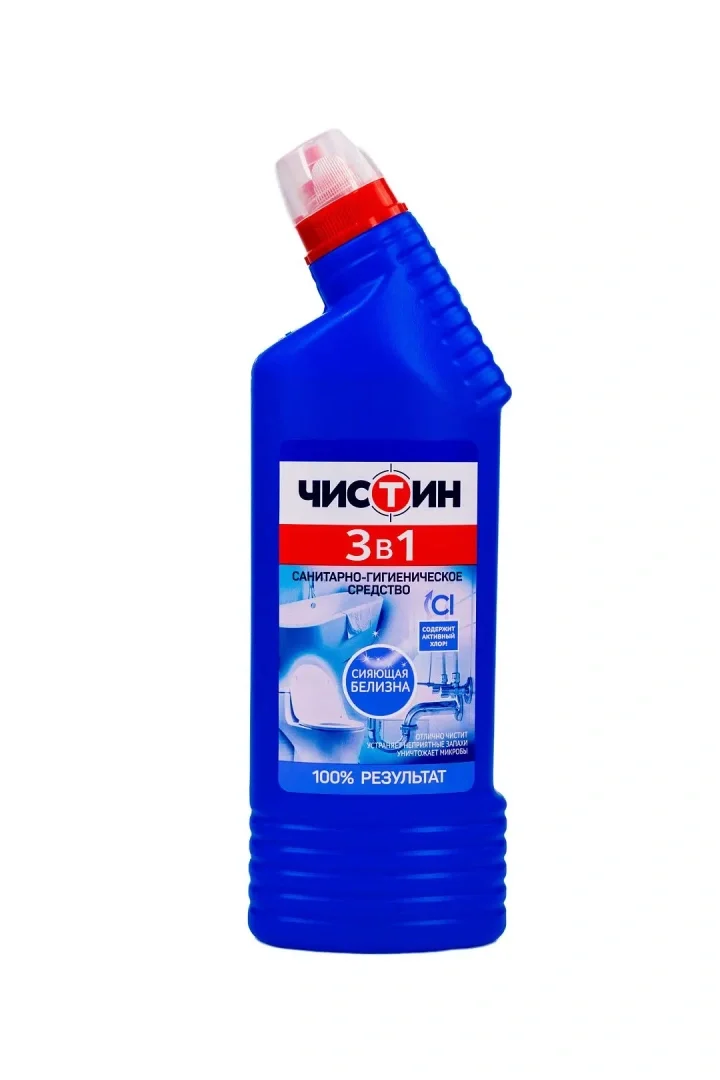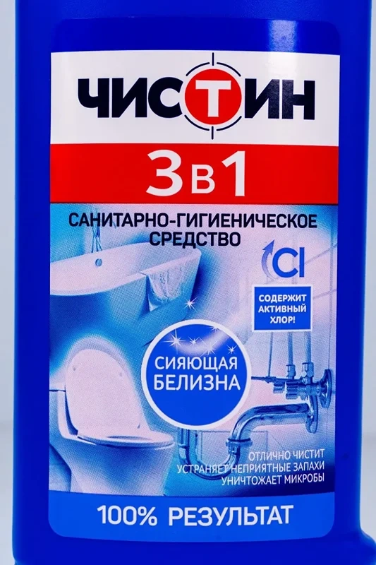 ЧИСТИН 3в1 750мл. Состав: < 5%: гипохлорит натрия; < 5% : АПАВ или мыло на основе натуральных жирных кислот, НПАВ; < 5 %: щелочь, соль ЭДТА, ароматизирующая добавка.