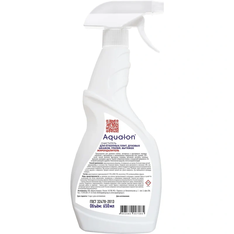 Чистящее средство для плит/духовок/грилей Aqualon Жироудалитель 0,65 л от жира и нагара спрей для стеклокерамики Назначение. Высокоэффективное средство для удаления стойких, застарелых ипригоревших жировых отложений снержавеющих иэмалированных поверхностей плит, духовок, СВЧ-печей, грилей, вытяжек, фритюрниц, сковород, противней, кастрюль, кухонных фартуков, шампуров идругих. Удаляет неприятные запахи сочищаемой поверхности. Неоставляет разводов ицарапин. Низкопенное средство, легко смывается водой. Способ применения. Перед применением убедитесь, что поверхность негорячая. Отключите перед чисткой электроприборы отисточника тока. Встряхните флакон. Поверните носик распылителя вположение 'ON' или 'SPRAY'. Нанесите средство равномерно наповерхность, избегая попадания втруднодоступные для вытирания места иалюминиевые поверхности. При сильных загрязнениях оставьте на5-7минут. Почистите, затем тщательно удалите остатки средства споверхности. Протрите влажной тряпкой или губкой поверхность. При необходимости процедуру повторить. Меры предосторожности. Неприменять при наличии противопоказаний винструкции кизделию! Беречь отдетей! Неиспользовать для чистки алюминиевых, лакированных иполированных поверхностей. Рекомендуется использовать перчатки. Избегать попадания наслизистые оболочки. Вслучае попадания- промыть большим количеством воды. Вслучае проглатывания немедленно обратиться кврачу, показав флакон иэтикетку. Состав. Вода очищенная, гидроксид натрия (5-15%), нПАВ (<5%), загуститель (<5%), активные добавки, отдушка. Условия хранения. Хранить при комнатной температуре ввертикальном положении, избегать попадания прямых солнечных лучей. Вслучае замерзания после размораживания сохраняет свои свойства. После размораживания встряхнуть. Срок годности. 2года сдаты изготовления с даты изготовления (дату изготовления см. на упаковке).