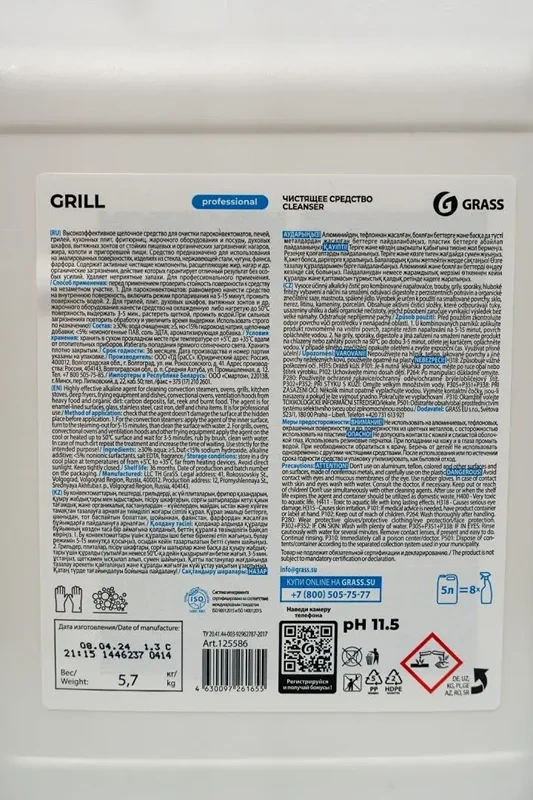 Моющее средство для грилей, духовок, пароконвектоматов Grass Grill Professional 5 л (готовое к применению средство). Высокоэффективное щелочное средство предназначено для очистки пароконвектоматов, печей, грилей, кухонных плит, фритюрниц, жарочного оборудования и посуды, духовых шкафов, вытяжных зонтов от стойких пищевых и органических загрязнений, таких как нагар, жир, копоть и пригоревшая пища. Средство подходит для использования на эмалированных, хромированных поверхностях, изделиях из стекла, нержавеющей стали, чугуна, фаянса и фарфора. Содержит активные компоненты, расщепляющие жир, нагар и другие органические загрязнения, что обеспечивает эффективное очищение без особых усилий. Также удаляет неприятные запахи.