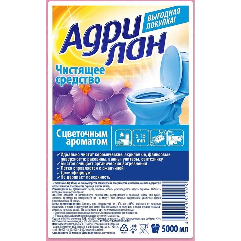 Гелеобразный пенный концентрат против пищевых, улично-бытовых, мыльных и слизистых загрязнений, а так же серого налёта и следов плесени на керамических, каменных, пластиковых, деревянных поверхностях, на нержавеющей стали. Уничтожает патогенные микроорганизмы, в том числе плесневые микрогрибы и их споры. Легко смывается. Расход: чистка и отбеливание сантехники - готов к применению; отбеливание посуды и инвентаря - 100 мл/1л воды (10% р-р).