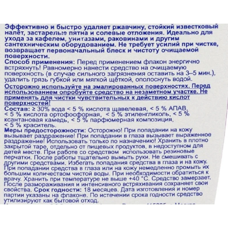 Состав: ≥30% вода, <5% щавелевая кислота, <5% АПАВ, ксантановая камедь, <5% парфюмерная композиция, <5% краситель.