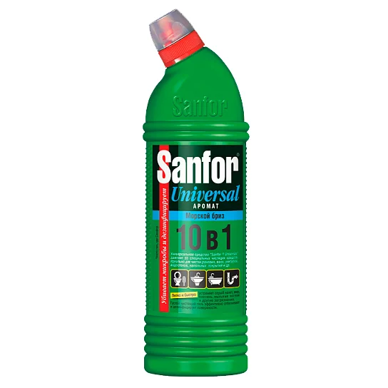 Sanfor Universal 10 в 1 разработан для чистки сантехнического оборудования и систем, кухонных плит и корпусов другой бытовой техники, твердых напольных покрытий, керамической плитки, моющихся обоев, настенных панелей. Препарат эффективно борется с серым налетом, засохшими мыльными потеками, жиром, плесенью, въевшиеся пятнами от пищевых продуктов.