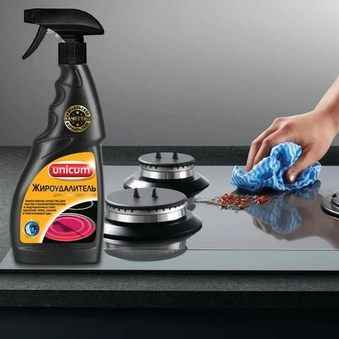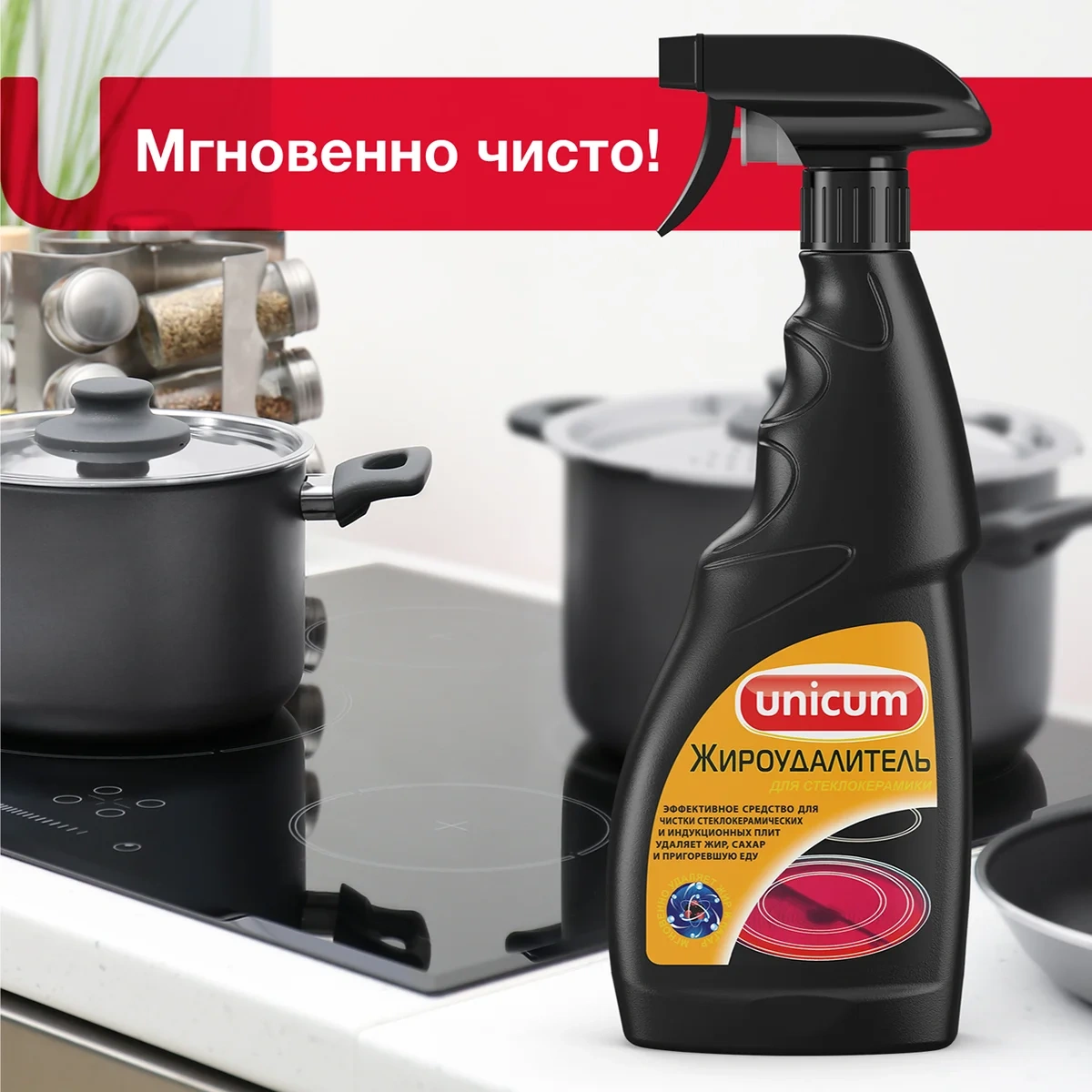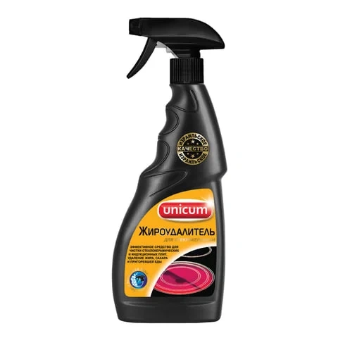 Жироудалитель для чистки стеклокерамических плит Unicum, 500 мл специально разработан для быстрого и эффективного ухода за варочными поверхностями. Он подходит для очистки стеклокерамических электрических и индукционных плит, моментально растворяя и удаляя с них нагар, жир, остатки продуктов, масло и другие загрязнения. Средство деликатно ухаживает за эмалью, не оставляет на ее поверхности царапин и разводов, придает стеклокерамике безупречную чистоту и красивый блеск. Оно образует на очищенной поверхности тонкую нанопленку, которая защищает плиту от последующих загрязнений. Жироудалитель подходит не только для стеклокерамики. Его можно также использовать для мытья других загрязненных поверхностей: раковины, кухонного фартука, духового шкафа, посуды. Средство содержит щелочь в составе, поэтому им нельзя пользоваться для ухода за алюминиевыми и окрашенными изделиями. Перед началом уборки необходимо обязательно надеть на руки перчатки. Жироудалитель помещен во вместительную пластиковую бутылку объемом 500 мл с практичным распрыскивателем, который дает возможность быстро и экономично распределить средство по обрабатываемой поверхности.