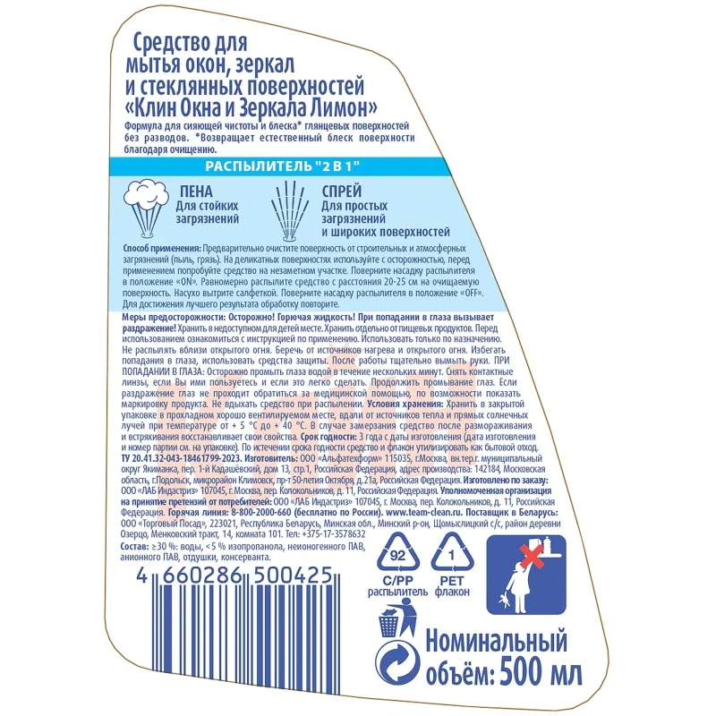 Назначение. Clin — это эксперт в очистке стекол и окон без разводов. Уникальная формула Clin с изопропиловым спиртом делает стеклянные поверхности блестящими и чистыми, не оставляя разводов и избавляя от изнурительной полировки. Курковый распылитель Clin имеет два режима функционирования: стандартное и пенообразующее, которое подходит для удаления даже сильных загрязнений.