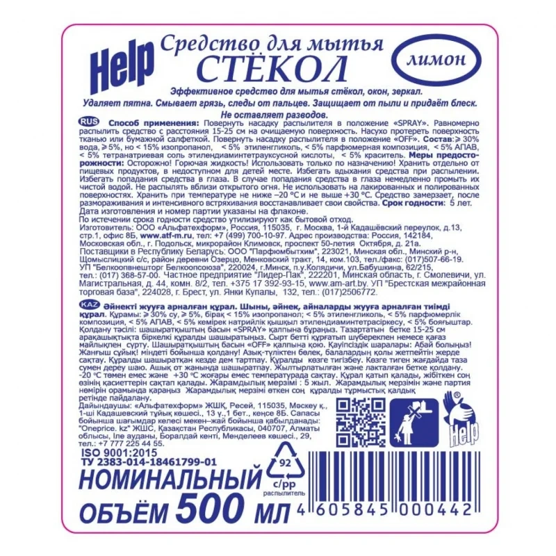 Назначение. Средство Help предназначено для мытья стёкол, окон и зеркал. Эффективно смывает грязь, пыль, следы рук и прочие загрязнения. Средство не оставляет разводов и следов, защищает от налипания пыли и придаёт поверхности блеск.