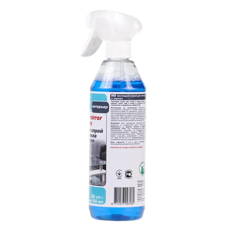 Средство для стекол HG чистящий спрей для стекла и зеркал 0,5л Удобное в применении чистящее средство HG легко и быстро удаляет пыль, грязь, жир и следы от пальцев со всех видов зеркальных и стеклянных поверхностей. Не оставляет разводов. Быстро высыхает. Имеет приятный запах. Способ применения: Равномерно распылите средство на очищаемую поверхность. Протрите сухой чистой матерчатой салфеткой или бумажным полотенцем. При необходимости удалите излишнюю влагу специальным влагоудалителем. Повторите обработку на сильно загрязненной поверхности. Меры предосторожности: Беречь от детей. В случае проглатывания немедленно обратиться за медицинской помощью и показать упаковку или этикетку чистящего средства. Состав: Неионогенные поверхностно-активные вещества, анионные поверхностно-активные вещества, консерванты: 2-бром-2-нитропропан-1,3-диол, отдушки < 5%. Условия хранения: Хранить в сухом прохладном месте. Предохранять от попадания прямых солнечных лучей. Срок годности: 7 лет от даты производства.