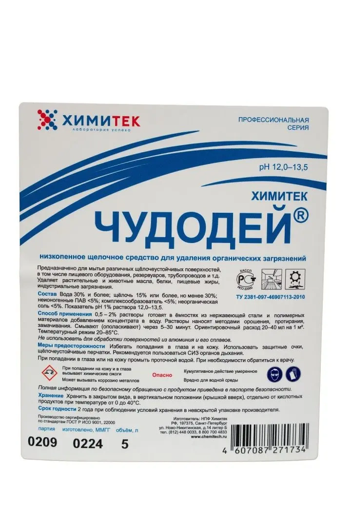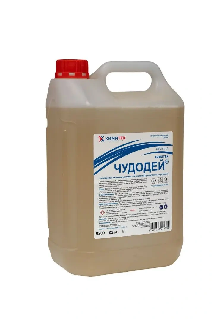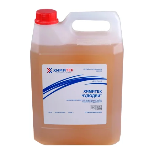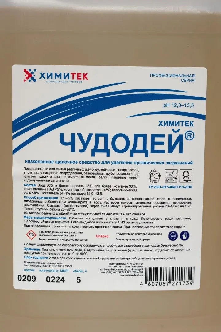 Химитек Чудодей - концентрированное жидкое низкопенное щелочное средство для удаления органических загрязнений. Предназначено для очистки пищевого технологического оборудования, резервуаров, трубопроводов и других твёрдых поверхностей различного назначения. Удаляет разнообразные комбинированные загрязнения: растительные и животные масла, белки, пищевые жиры, индустриальные загрязнения.