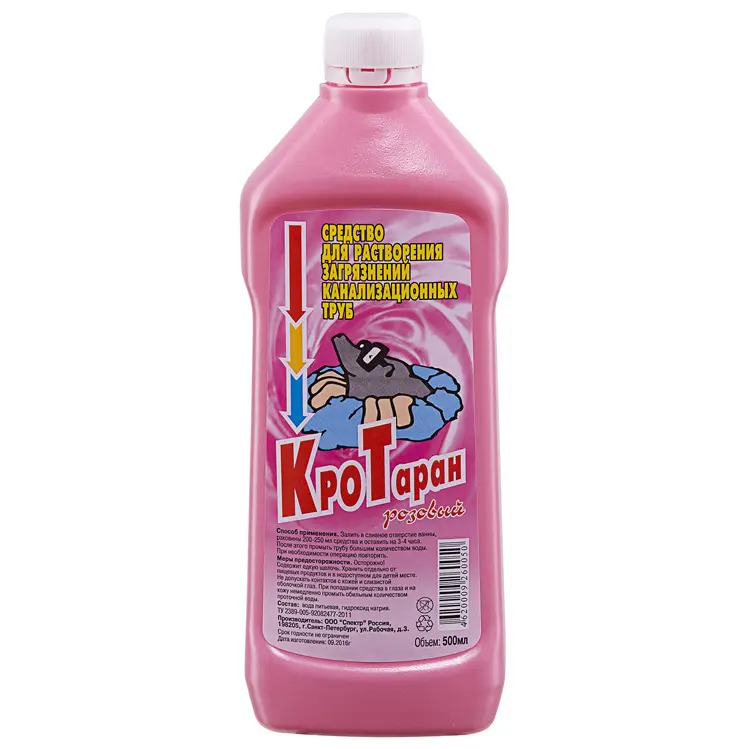 Средство для прочистки труб Кро Таран жидкость 500мл.Средство предназначено для прочистки канализационных труб. Быстро и эффективно растворяет в стоках известковый налет, волосы, остатки пищи, жир, бумагу и другие загрязнения. Безопасно для всех видов труб. Может быть использовано для удаления засоров и в профилактических целях.