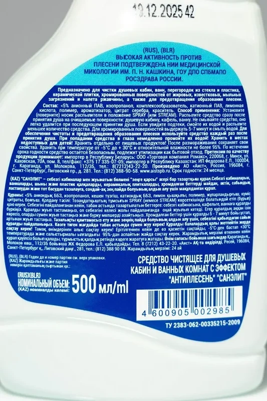 САНЭЛИТ-Антиплесень 500мл (с триггером).Предназначено для чистки душевых кабин, ванн, перегородок из стекла и пластика, керамической плитки, хромированных поверхностей от жировых, известковых, мыльных загрязнений и налета ржавчины, а также для предотвращения образования плесени.Состав: менее 5% а-ПАВ, изопропанол, комплексообразователь, катионнный ПАВ, лимонная кислота, полимер. Дополнительно: ароматизатор, цитрат серебра, краситель.Срок годности: 24 мес.ТУ 2383-062-00335215-2009