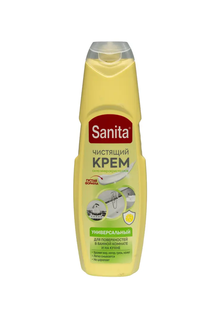 Санита Универсал: средство для ежедневной очистки кухонных поверхностей и ванной комнаты.Состав: б. 30 % мягкий абразивный наполнитель, < 5 % сода, < 5 % АПАВ и НПАВ , < 5%: консервант, краситель, ароматизатор.