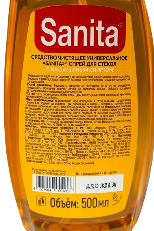 Средство чистящее универсальное 'Sanita' спрей для стекол с НАШАТЫРНЫМ СПИРТОМСостав: 5- 15% растворители, в том числе спирт изопропиловый, < 5%: АПАВ и НПАВ, < 5%: силикон, аммоний углекислый, краситель, ароматизирующая добавка.