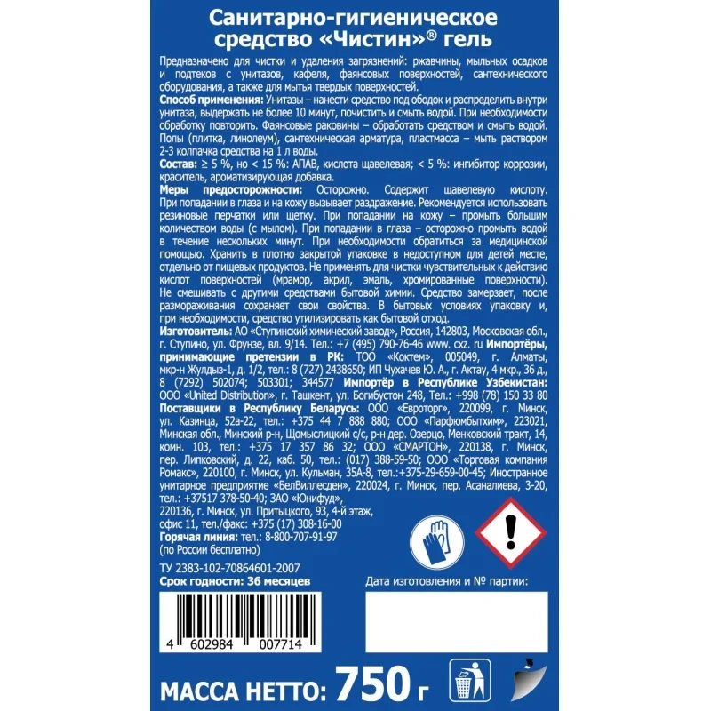 Чистящее средство санитарно-гигиеническое Чистин, гель, 750мл