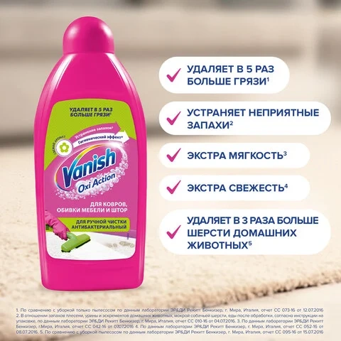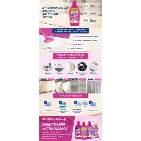 Назначение: Антибактериальный шампунь для ручной чистки ковров Vanish уничтожает микробы на 99.9%. Средство чистящее жидкое для ковров. Убивает микробы на 99,9%.