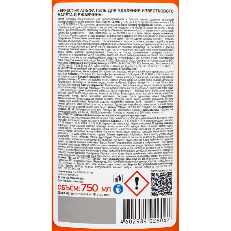 Чистящий гель для удаления известкового налета и ржавчины кислотное 750 мл, EFFECT 'Alfa 109', 25915