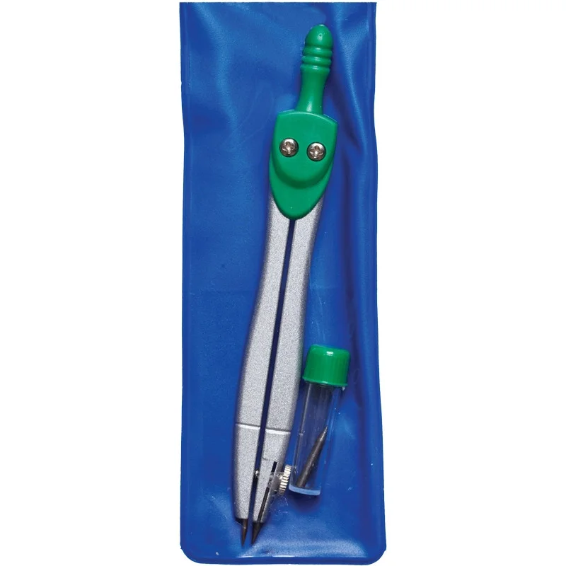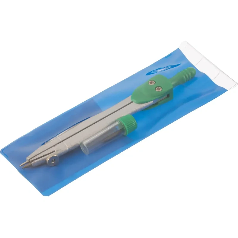 Набор предназначен для учебного использования, подходит для школьников средних и старших классов. Циркуль выполнен из металлического сплава с несгибаемыми штангами и фиксирующим болтом для надежной фиксации подвижной части. Диаметр чертежной окружности достигает 180 мм. В комплекте запасной грифель. Изделие упаковано в ПВХ-чехол с европодвесом, что обеспечивает удобное хранение и размещение. Корпус циркуля имеет серебристый цвет. Производитель — Китай. В промежуточной упаковке содержится 50 наборов, в транспортной упаковке — 600.