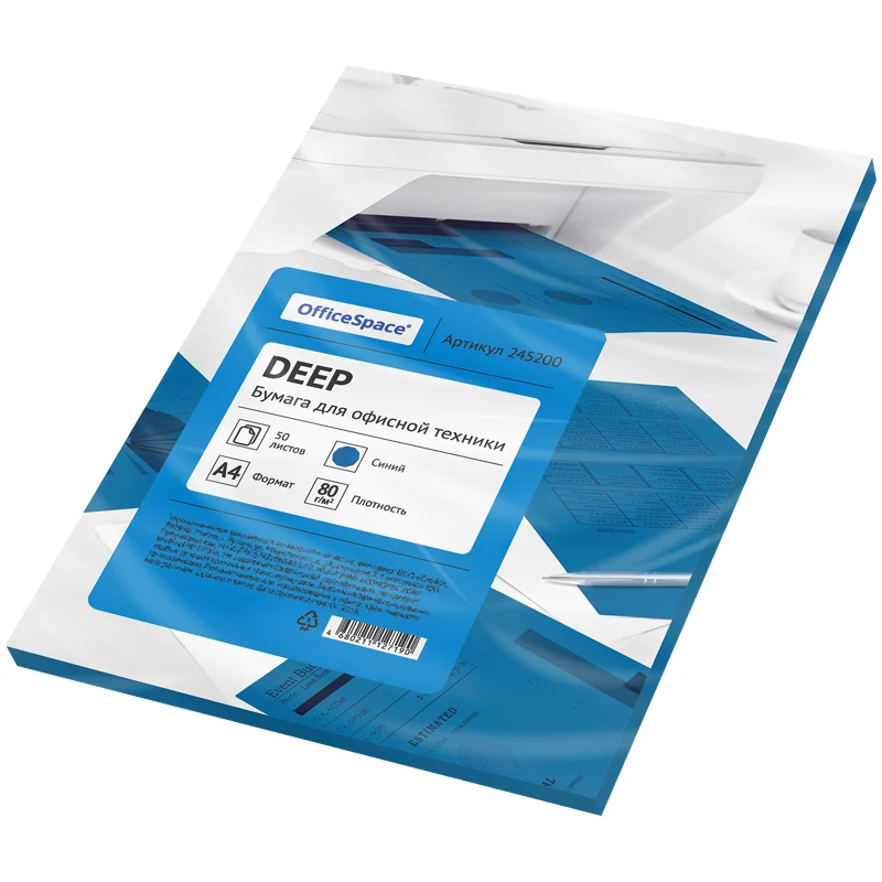 Бумага офисная цветная OfficeSpace deep формата А4 – отличный вариант для печати и использования в офисе и дома. Плотность – 80 гр/м2. В упаковке бумаги OfficeSpace deep 50 листов. Бумага для принтера имеет умеренно-интенсивный синий цвет. Упакована в пакет с клеевой полосой. В коробке 50 пачек бумаги.