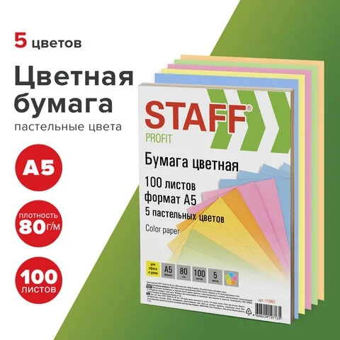 Цветная бумага для принтера Staff Color 5 цветов, А5, 100 листов, 80г/м2