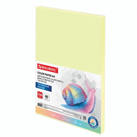 Бумага цветная BRAUBERG, А4, 80 г/м2, 100 л., пастель, желтая, для офисной техники, 112446