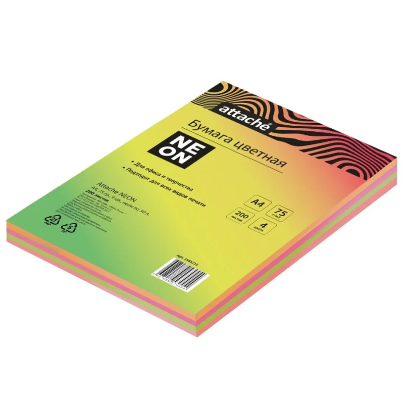 Бумага цветная Attache 'Неон' (А4,75г, 4цв. неон по 50л.) пачка 200л