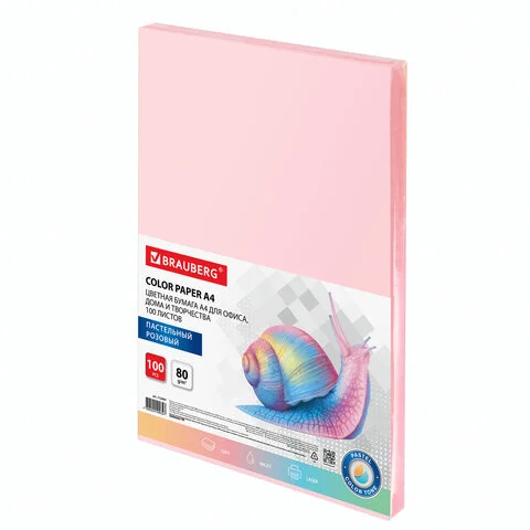 Бумага цветная BRAUBERG, А4, 80 г/м2, 100 л., пастель, розовая, для офисной техники, 112447