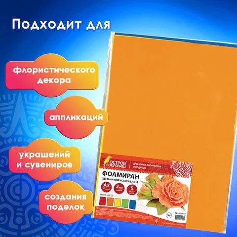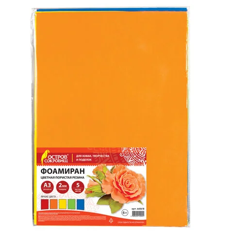 5 радужных цветов формата А3 позволят создать уникальную и эффектную поделку! Толщина каждого листа - 2 мм, размер листа - 29,7х21 см. Материал очень прост в использовании: легко режется обычными ножницами, ему можно придать любую форму растягивая и скручивая.