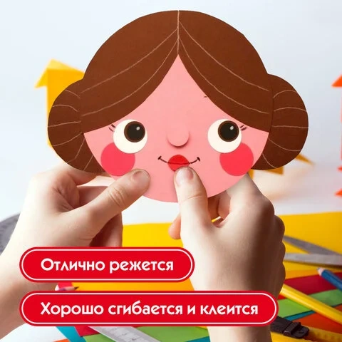 Немелованный картон с улучшенной прокраской обладает плотностью 200 г/м2. Имеет цветную поверхность с одной стороны и темный оборот. Может использоваться, начиная с трехлетнего возраста. Картон легко режется ножницами, сгибается и клеится. Внутренний блок состоит из 10 листов формата А4 (200х283 мм) и 10 цветов: 8 основных + золото и серебро.