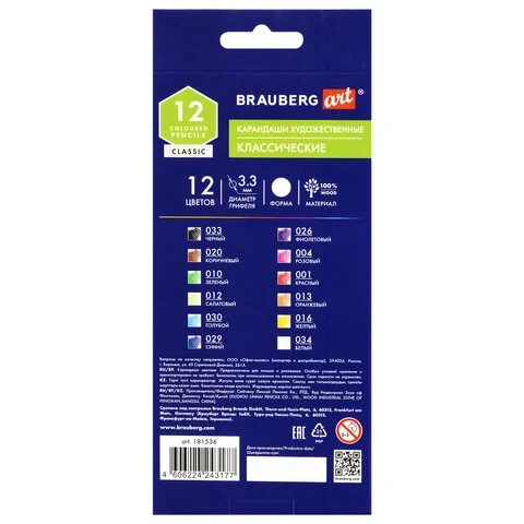 Карандаши художественные цветные BRAUBERG ART CLASSIC, 12 цветов, МЯГКИЙ грифель 3,3 мм, 181536