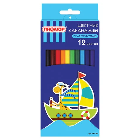 Карандаши цветные ПИФАГОР 'ЖИРАФ', 12 цветов, пластиковые, классические заточенные, 181250