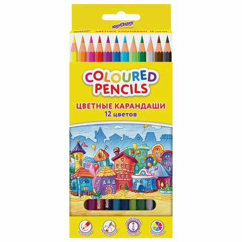 Карандаши цветные ЮНЛАНДИЯ 'ДОМИКИ', 12 цветов, пластиковые, классические, грифель мягкий 3 мм, 1818