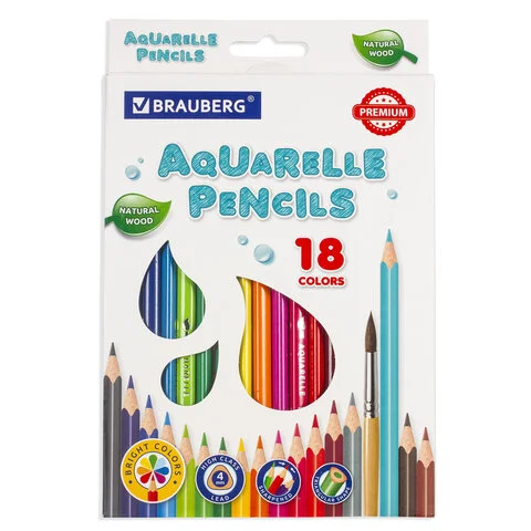 Карандаши цветные акварельные BRAUBERG PREMIUM AQUARELLE, 18 цветов, грифель мягкий 4 мм, 181672