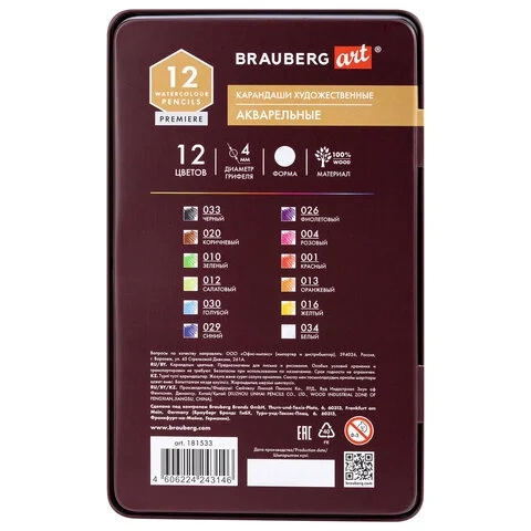 Карандаши художественные цветные акварельные BRAUBERG ART PREMIERE, 12 цветов, грифель 4 мм, металл,