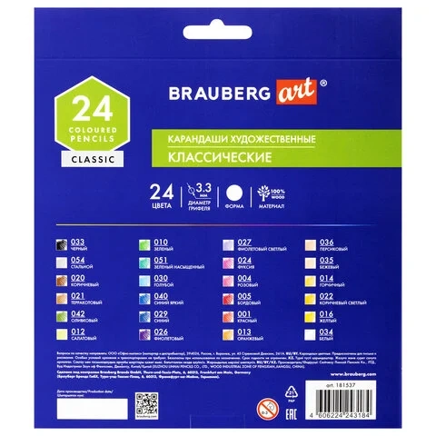 Карандаши художественные цветные BRAUBERG ART CLASSIC, 24 цвета, МЯГКИЙ грифель 3,3 мм, 181537