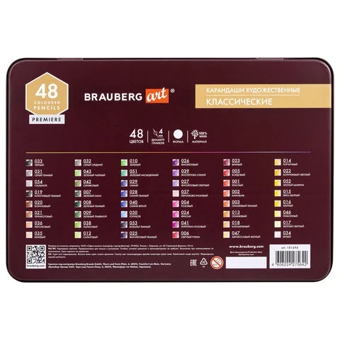 Карандаши цветные художественные BRAUBERG ART PREMIERE, НАБОР 48 цветов, 4 мм, металл кейс, 181694
